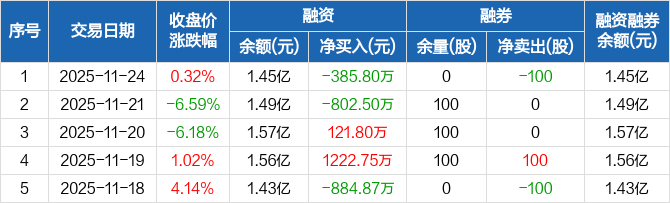 融资方面,当日融资买入2393.12万元,融资偿还2778.92万元,融资净偿还385.8万元。融券方面,融券卖出0股,融券偿还100股,融券余量0股,融券余额0元。融资融券余额合计1.45亿元。