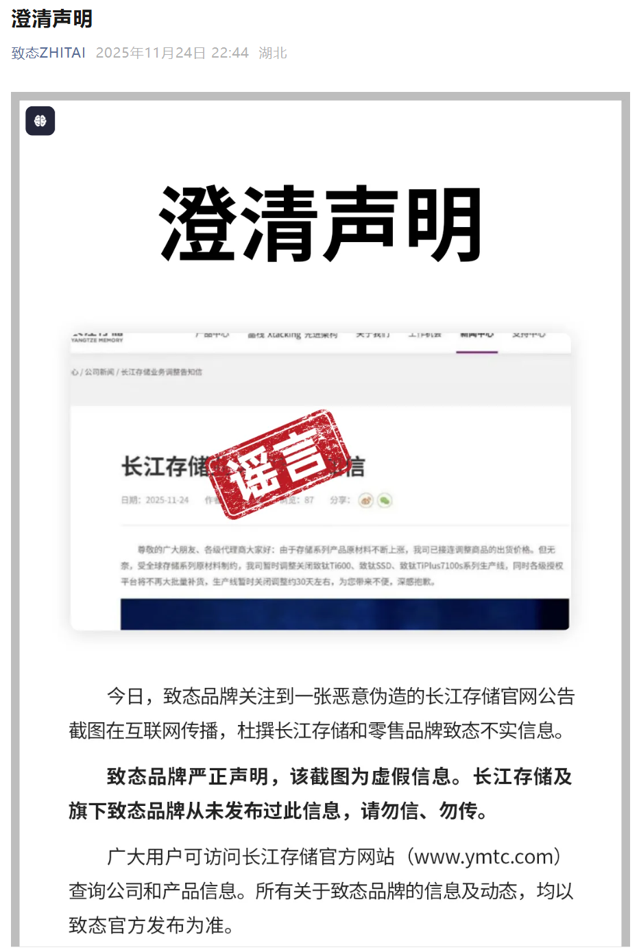 每经AI快讯,11月24日晚,长江存储旗下致态品牌发布声明称,关注到一张恶意伪造的长江存储官网公告截图在互联网传播,杜撰长江存储和零售品牌致态不实信息。声明称:“该截图为虚假信息。长江存储及旗下致态品牌从未发布过此信息,请勿信、勿传。”