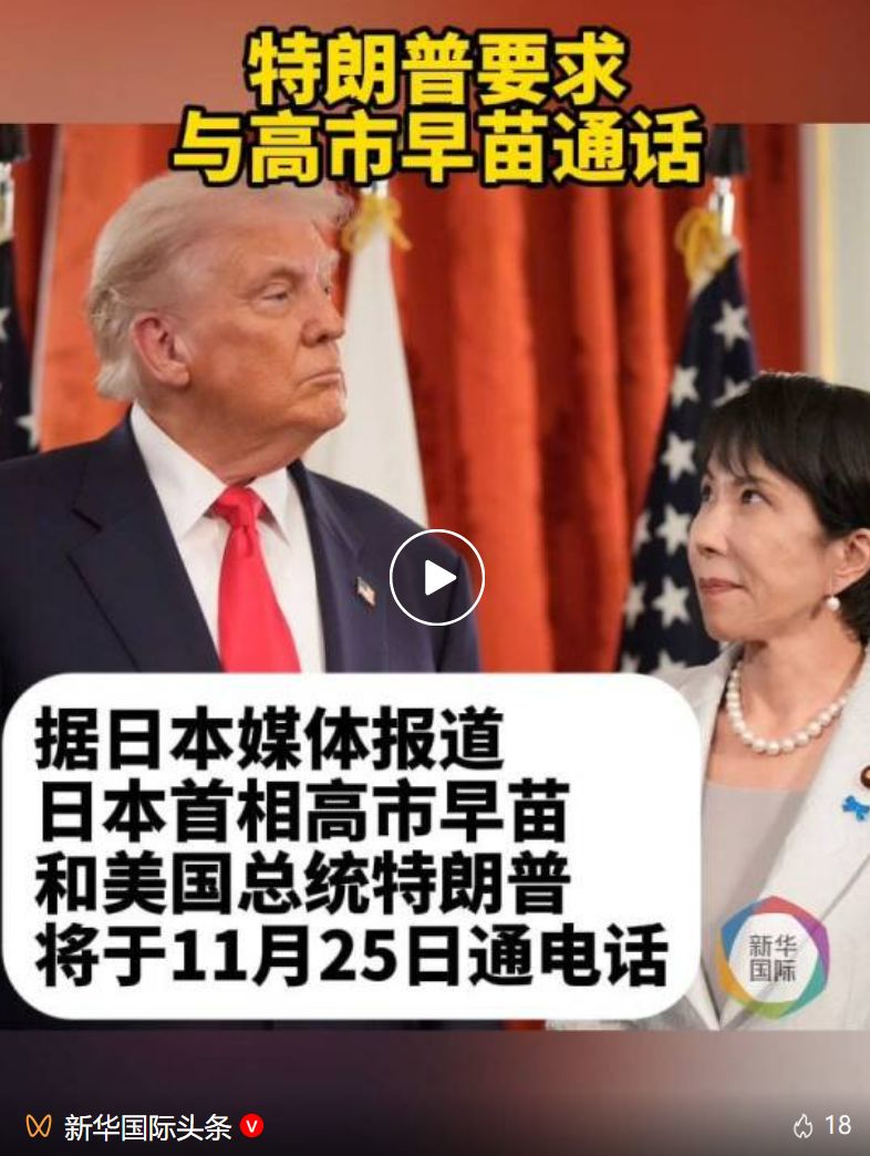 据新华国际头条官方微信号,日本富士新闻网报道,日本首相高市早苗和美国总统唐纳德·特朗普准备于11月25日通电话。据报道,此次通话要求是特朗普方面提出的。