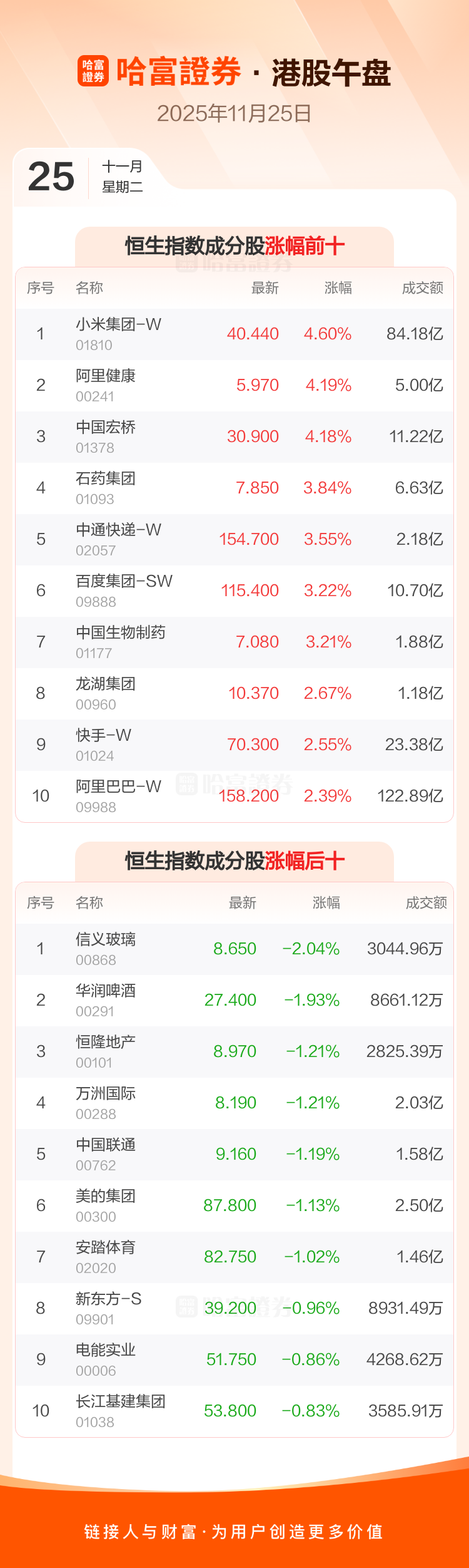 港股11月25日午盘走高,恒生指数收报25875.36点,涨158.86点,涨幅0.62%;恒生科技指数收报5609.71点,涨64.15点,涨幅1.16%。恒生指数成分股中小米集团-W、阿里健康、中国宏桥涨幅居前,信义玻璃、华润啤酒、恒隆地产跌幅靠前。恒生科技指数成分股中哔哩哔哩-W、小米集团-W、阿里健康涨幅居前,金蝶国际、美的集团、京东集团-SW跌幅靠前。