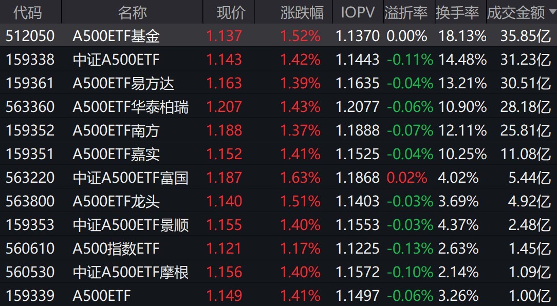 市场早盘集体走强,中证A500指数上涨1.49%,3只中证A500相关ETF成交额超30亿元