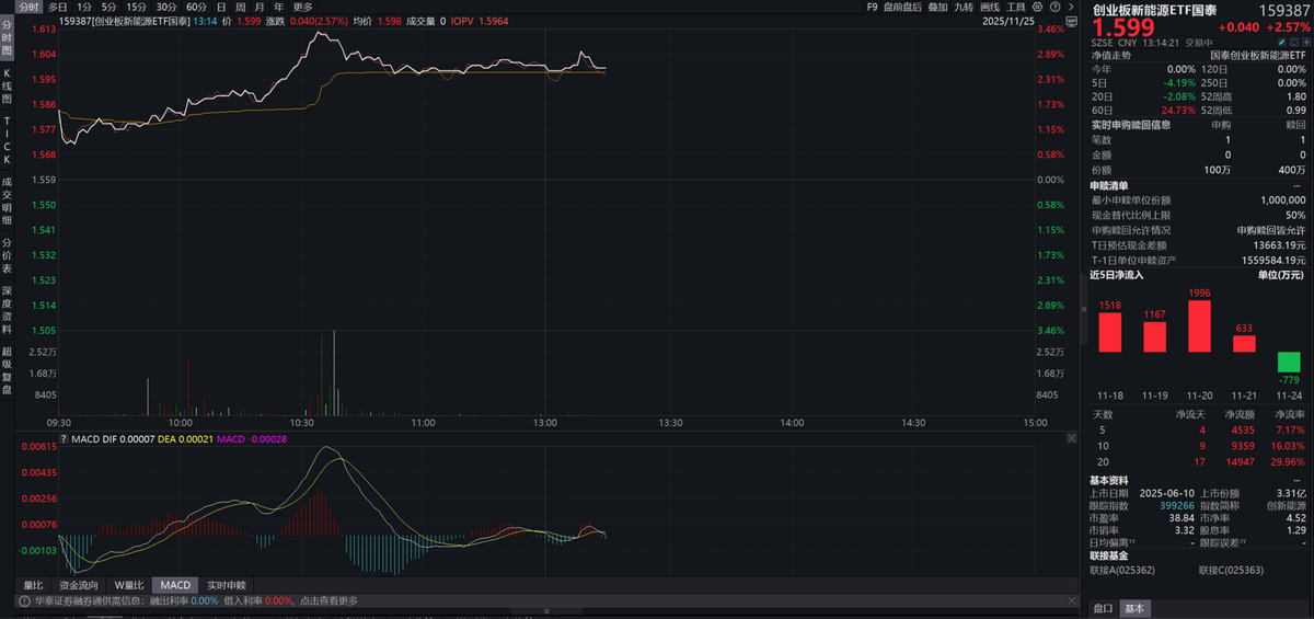 11月25日,受近期新能源利好影响,新能源板块迎来上涨,创业板新能源ETF(159387)涨超2.5%,资金持续布局,近20日净流入近1.5亿元。