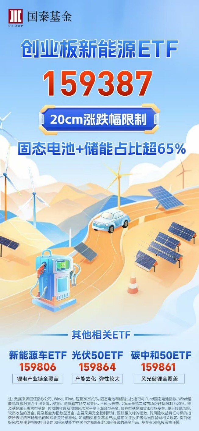 新能源产业链有望凭借技术拐点,打开新的增长空间。创业板新能源ETF国泰(159387)跟踪的是创业板新能源指数,ETF最大涨跌幅达20%,该指数从市场中选取涉及清洁能源生产、存储及应用等业务的上市公司证券作为指数样本,固态电池+储能占比超65%。感兴趣的小伙伴可以通过创业板新能源ETF国泰(159387)一键把握新能源板块的投资机遇。