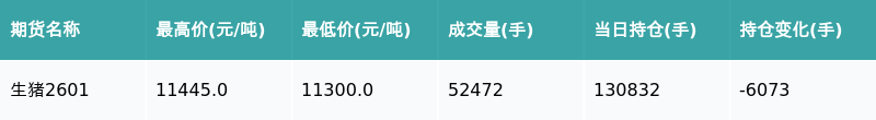 南财智讯11月25日电,南财金融终端盘后期货数据显示,大连商品交易所的生猪主力合约收涨0.04%,收盘报11415.0元/吨,日内资金流出1.72亿元。其他相关指标见下表: