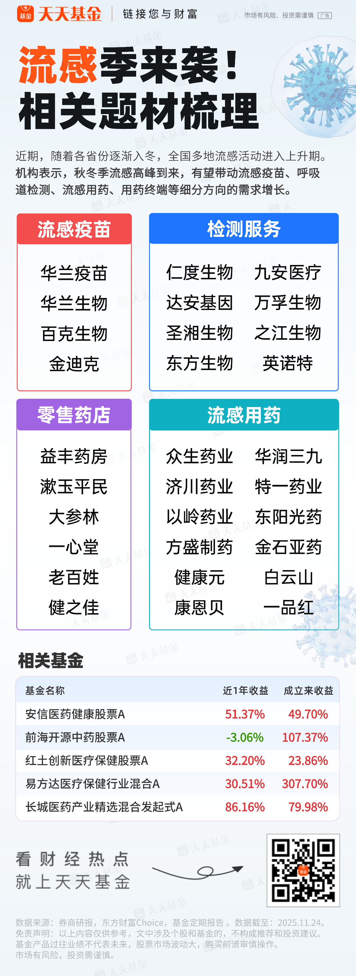 德邦证券认为,本轮流感上升趋势快,有望催生就医和治疗需求。目前我国主要用于治疗流感的抗病毒药物包括奥司他韦、玛巴洛沙韦等,另外感冒类和退热类药物也有使用,流感疫情直接带动其需求。另外,中成药是流感和普通感冒治疗中的常用药,尤其是在儿童治疗上,关注有相关产品的企业。此外,检测是流感诊疗的第一步,院内门急诊检测需求有望大量提升,居家监测需求有望提升。中邮证券也表示,流感样病例占比快速爬坡,相关检测治疗产品有望放量。