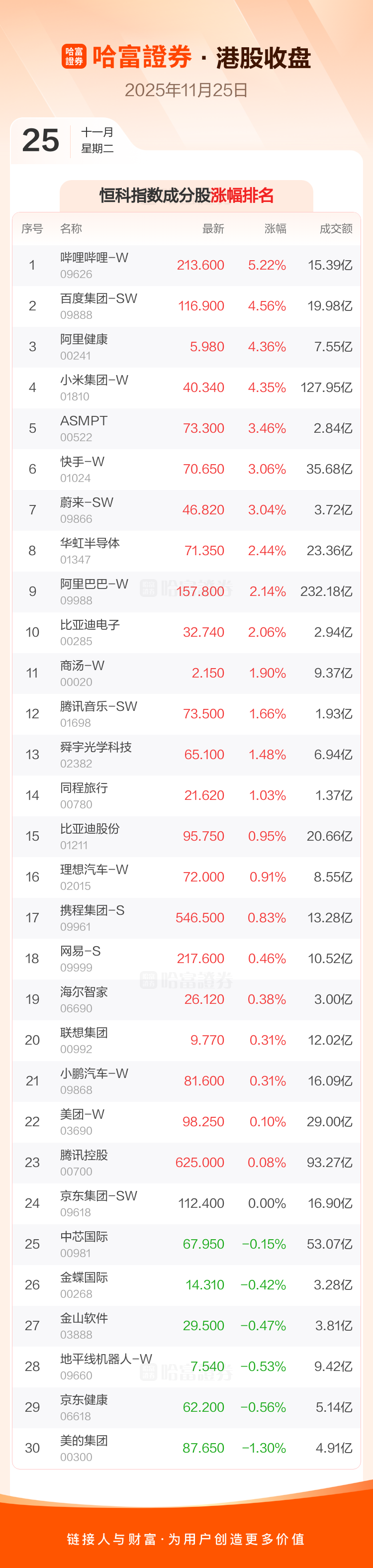 港股收盘:恒指涨0.69% 百度集团-SW领涨成分股