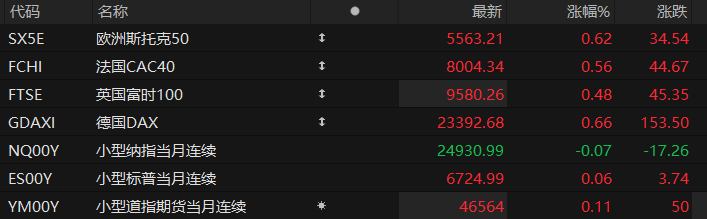 周二盘前,美股三大股指期货涨跌不一,欧洲主要指数普遍上涨。截至发稿,纳斯达克100指数期货跌0.07%,标普500指数期货涨0.06%,道指期货涨0.11%。