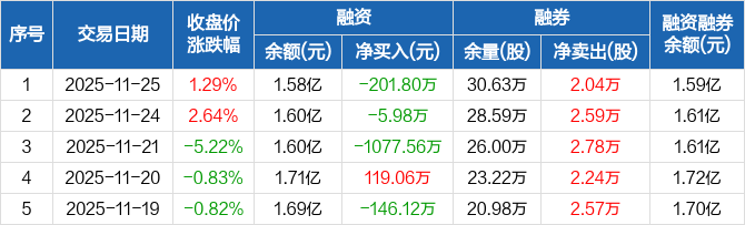 融资方面,当日融资买入566.28万元,融资偿还768.08万元,融资净偿还201.8万元,连续3日净偿还累计1285.34万元。融券方面,融券卖出2.08万股,融券偿还400股,融券余量30.63万股,融券余额144.57万元。融资融券余额合计1.59亿元。
