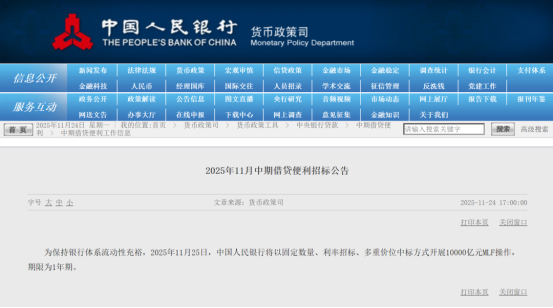 11月、12月是全年工作收官的关键时段。当前,央行通过多种工具维持市场流动性充裕,进而引导金融机构加大信贷投放,净投放是及时和必要的。央行通过MLF和买断式逆回购向银行体系注入中期流动性,有助于保持资金面处于较为稳定的充裕状态。