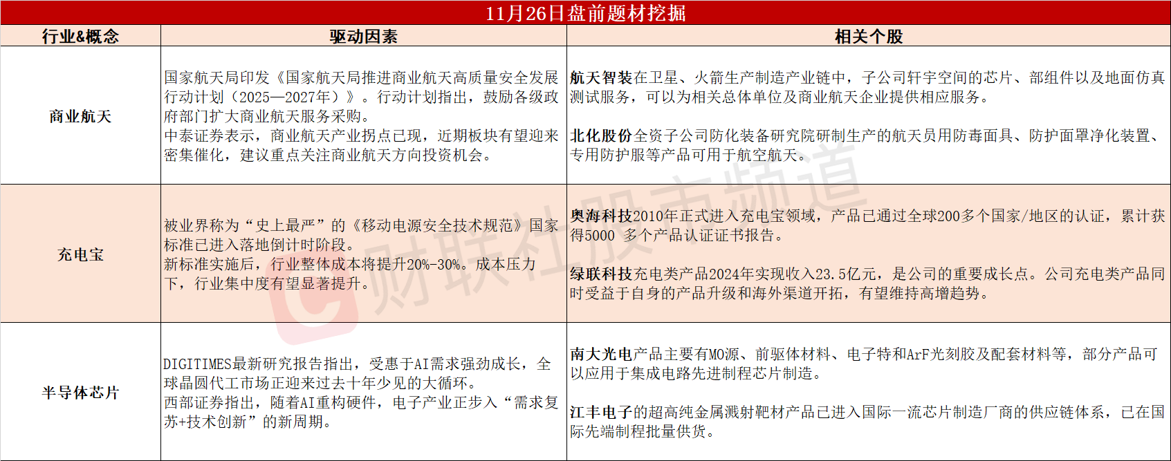 ①鼓励政府部门扩大商业航天服务采购,商业航天板块近期迎密集催化。②“史上最严”充电宝新规进入落地倒计时,充电宝产业集中度或显著提升。③AI需求强劲成长,半导体产业有望步入“需求复苏+技术创新”周期。