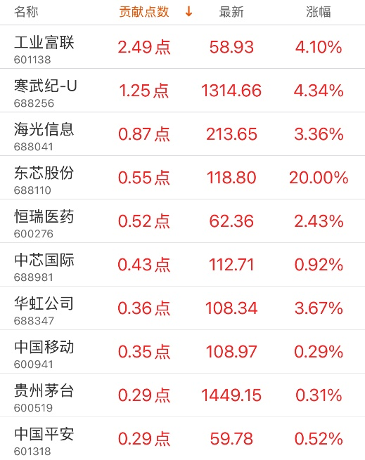 对上证指数贡献点数最多的个股是工业富联,贡献2.49点,该股当日涨4.10%,收盘价58.93元;拖累点数最多的个股是工商银行,拖累2.73点,该股当日跌1.81 %,收盘价8.16元。