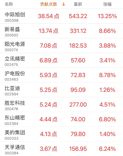 对深证成指贡献点数最多的个股是中际旭创,贡献38.54点,该股当日涨13.25%,收盘价543.22元;拖累点数最多的个股是中航成飞,拖累2.17点,该股当日跌2.1%,收盘价80.06元。