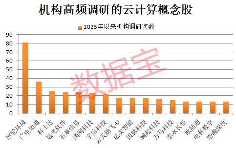 证券时报·数据宝统计,截至11月26日,今年以来机构调研10次以上的云计算概念股有24只。机构调研频次最高的是冰轮环境,该股年内累计获调研81次。其次是广电运通、科士达、石基信息、远光软件、顺网科技、宇信科技等。