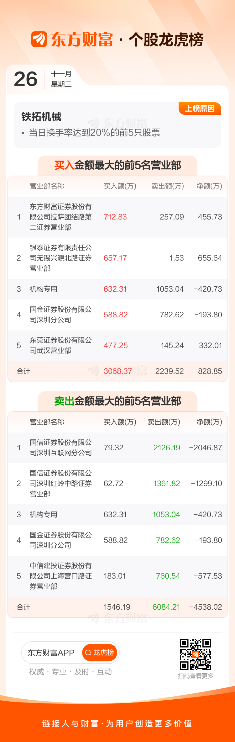 交易所2025年11月26日公布的交易公开信息显示,铁拓机械因成为当日换手率达到20%的前5只股票上榜。铁拓机械当日收报26.35元,涨跌幅-2.41%,偏离值29.98%,换手率29.98%,成交额3.69亿。