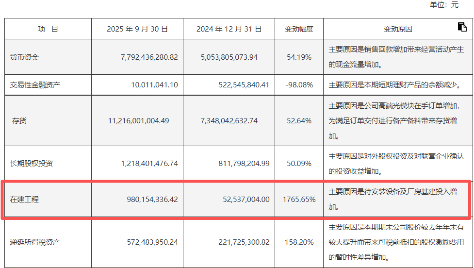产能扩张方面,中际旭创正积极应对订单高峰。财报显示,截至三季度末,中际旭创在建工程从2024年底的0.53亿元飙升至9.80亿元,增幅达1765.65%,主要原因是待安装设备及厂房基建投入增加。