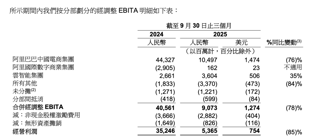 然而,由于持续加大对人工智能(AI)及即时零售等新兴业务的战略投入,本季度阿里巴巴经营利润同比大幅下降85%至53.65亿元;经调整EBITA(息税及摊销前利润)也同比下降78%,为90.73亿元。在非公认会计准则下,净利润为103.52亿元,同比下降72%。