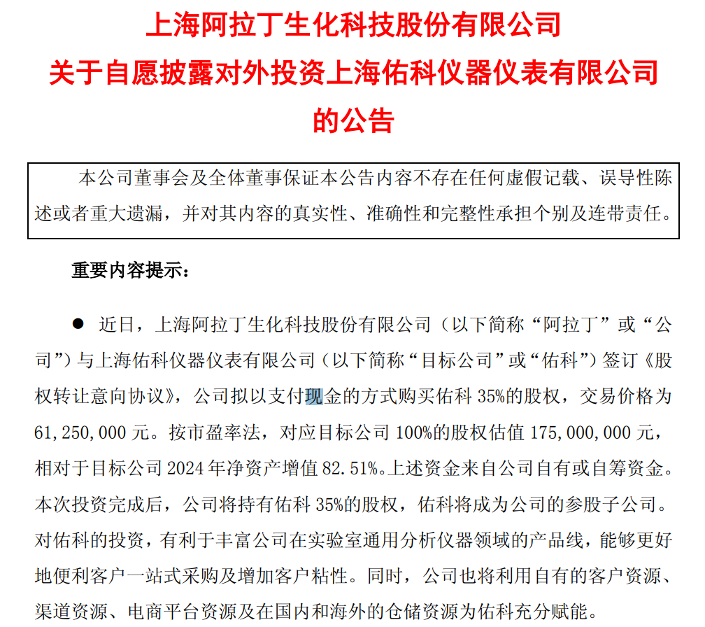 阿拉丁(688179)11月26日晚间公告,近日,公司与上海佑科仪器仪表有限公司(简称“佑科”)签订《股权转让意向协议》,公司拟以支付现金的方式购买佑科35%的股权,交易价格为6125万元。上述资金来自公司自有或自筹资金。