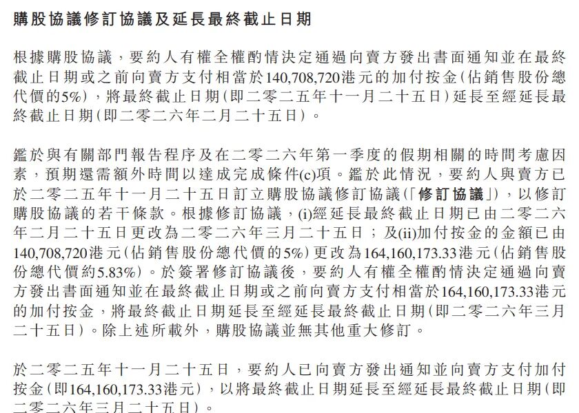 11月25日晚间,香港耀才证券公告称,考虑到与有关部门的报告程序及2026年一季度的假期因素,预计还需要更多时间来完成向国家发展改革委的申报。因此,要约人与卖方在当天修订了购股协议的若干条款,包括将最终截止日期延长至2026年3月25日,并将加付按金从1.4亿港元提升至1.64亿港元。