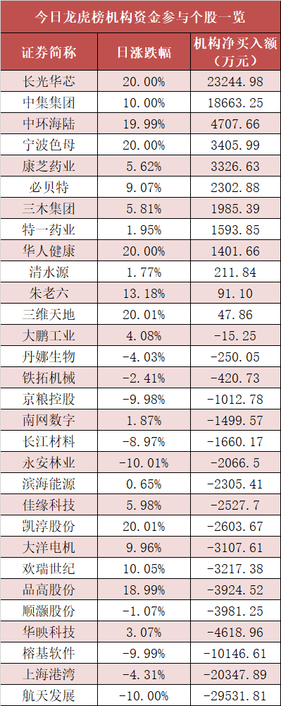 盘后龙虎榜数据显示,机构现身多股,其中长光华芯等股票呈现机构资金净买入,航天发展等股票呈现机构资金净卖出。