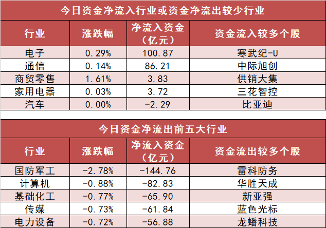 申万一级行业中,4个行业实现资金净流入,其中电子行业净流入100.87亿元居首。