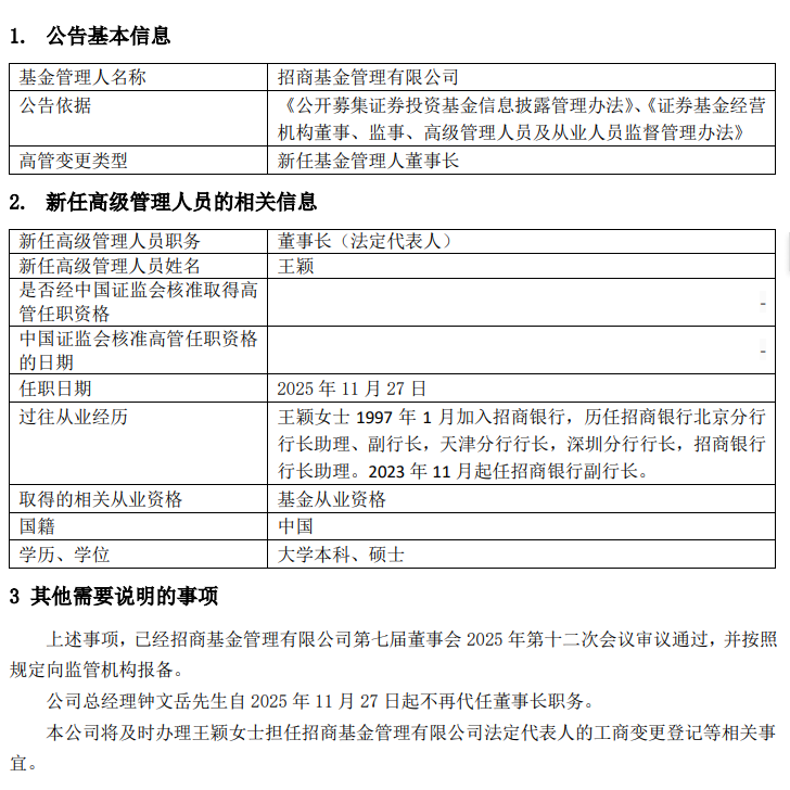 11月26日晚间,招商基金正式宣布,自11月27日起,王颖任招商基金董事长(法定代表人) 。同日,公司总经理钟文岳不再代任董事长职务。