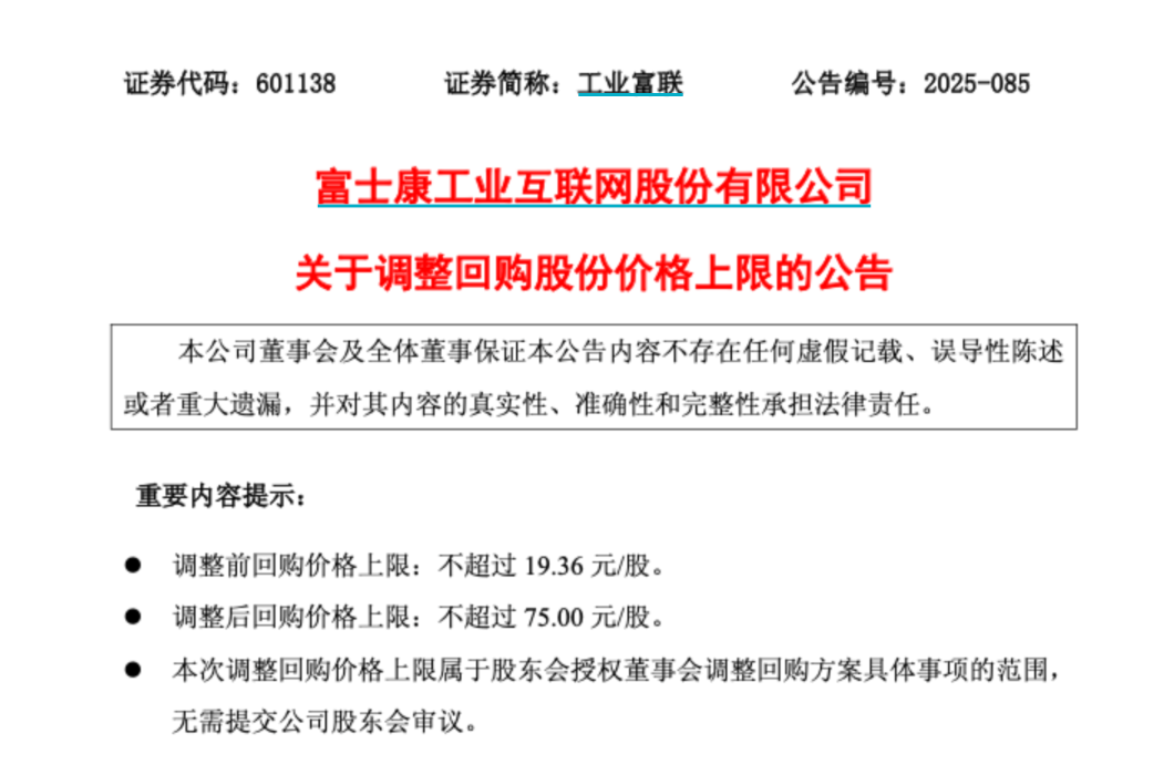 11月26日,工业富联宣布对回购股份方案进行调整,将回购价格上限从19.36元/股提升至75元/股,增幅达287.4%。