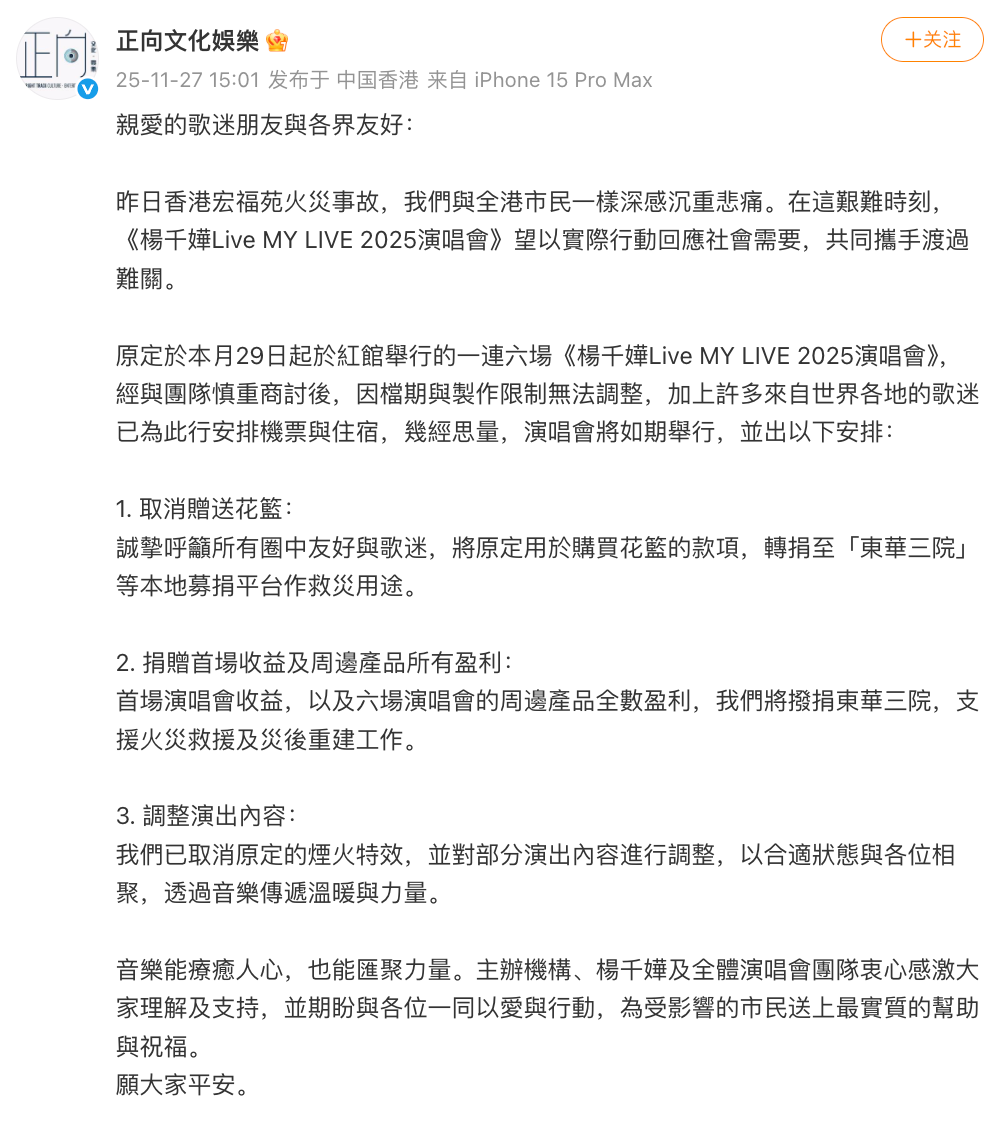 11月27日,杨千嬅经纪公司@正向文化娛樂发文称,昨日香港宏福苑火灾事故,我们与全港市民一样深感沉重悲痛,首场演唱会收益,以及六场演唱会的周边产品全部盈利,将拨捐东华三院,支援火灾救援及灾后重建工作。原定于本月29日起于红馆举行的一连六场《杨千嬅Live MY LIVE 2025演唱会》,经与团队慎重商讨后,因档期与制作限制无法调整,加上许多来自世界各地的歌迷已为此行安排机票与住宿,几经思量,演唱会将如期举行。
