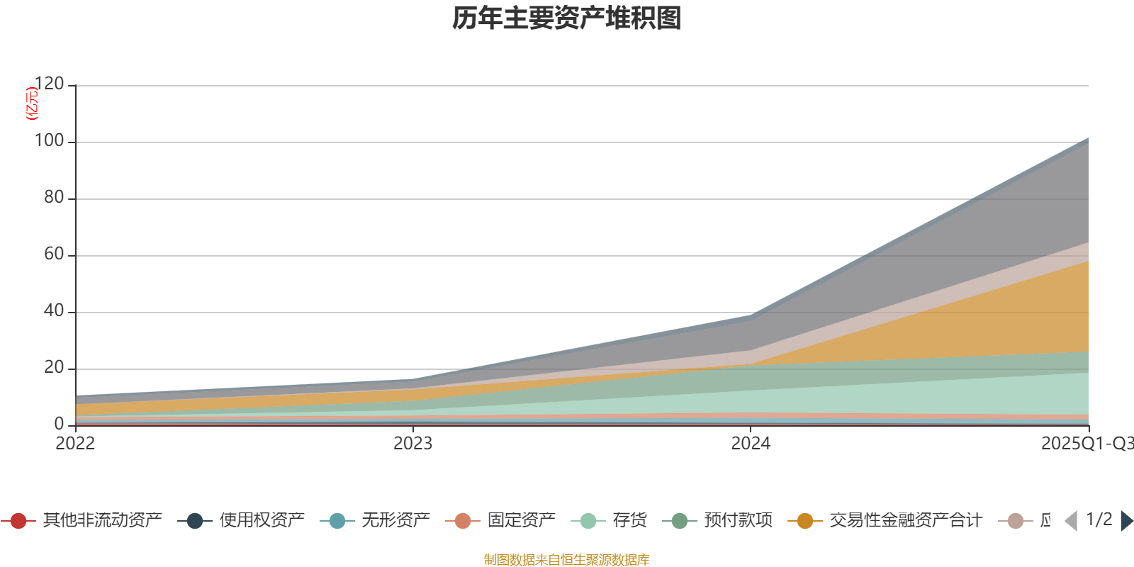 资产重大变化方面,截至2025年三季度末,公司交易性金融资产合计较上年末增加6265.99%,占公司总资产比重上升30.19个百分点;预付款项较上年末减少15.58%,占公司总资产比重下降15.48个百分点;货币资金较上年末增加239.39%,占公司总资产比重上升7.95个百分点;应收票据及应收账款较上年末增加36.15%,占公司总资产比重下降5.9个百分点。