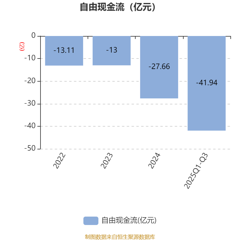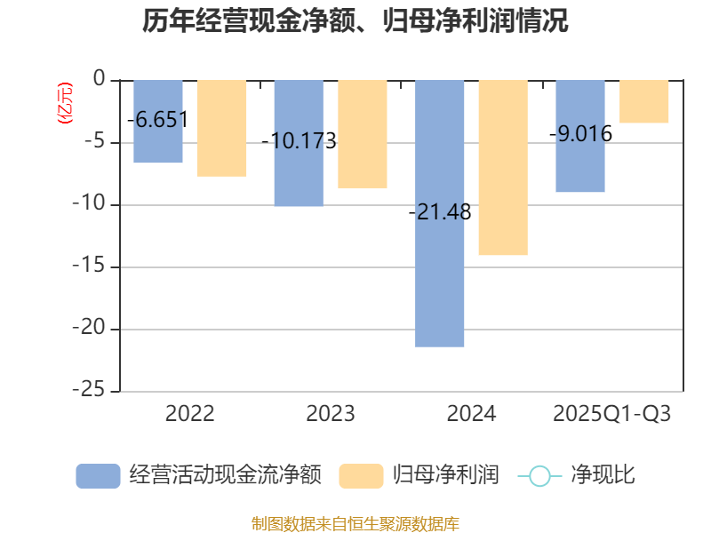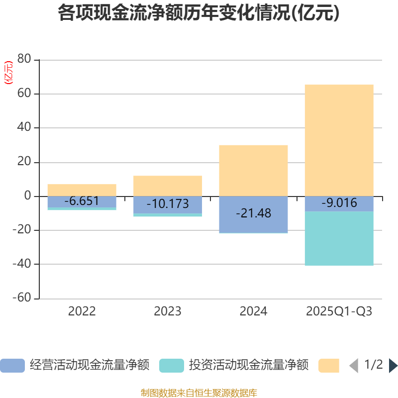 2025年前三季度,公司经营活动现金流净额为-9.02亿元,同比增加6.26亿元;筹资活动现金流净额65.4亿元,同比增加42亿元;投资活动现金流净额-31.72亿元,上年同期为-1.51亿元。