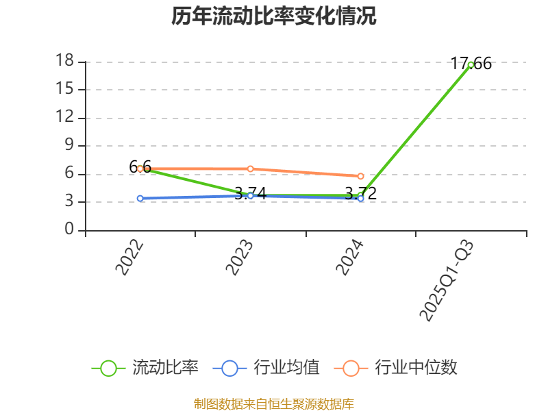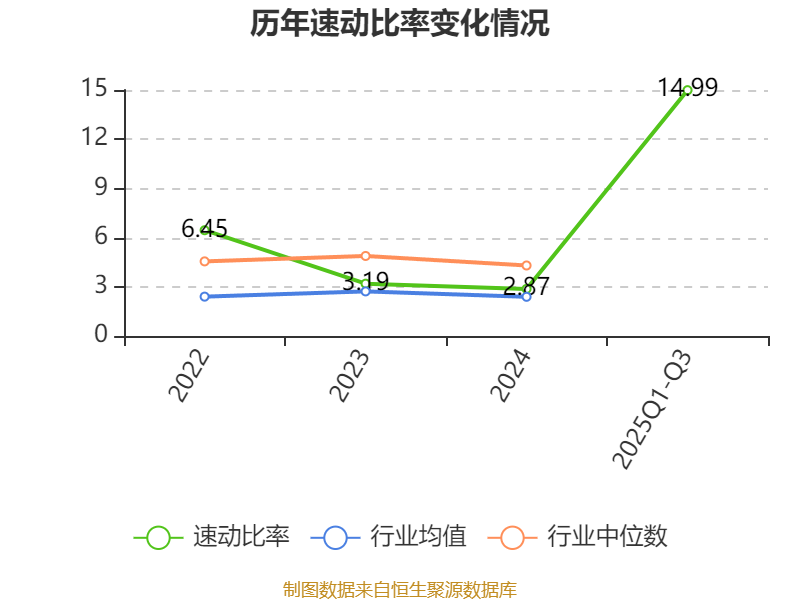 2024年,公司流动比率为3.72,速动比率为2.87。2025年前三季度,公司流动比率为17.66,速动比率为14.99。