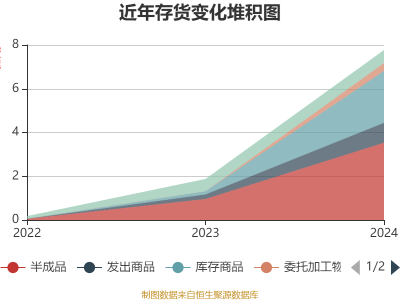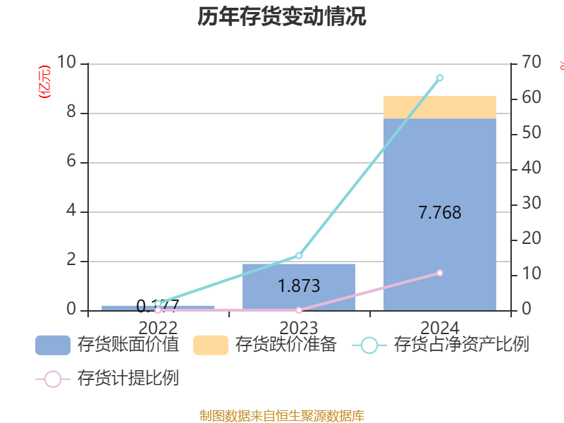 从存货变动来看,截至2024年末,公司存货账面价值为7.77亿元,占净资产的65.92%,较上年末增加5.89亿元。其中,存货跌价准备为9166.06万元,计提比例为10.55%。