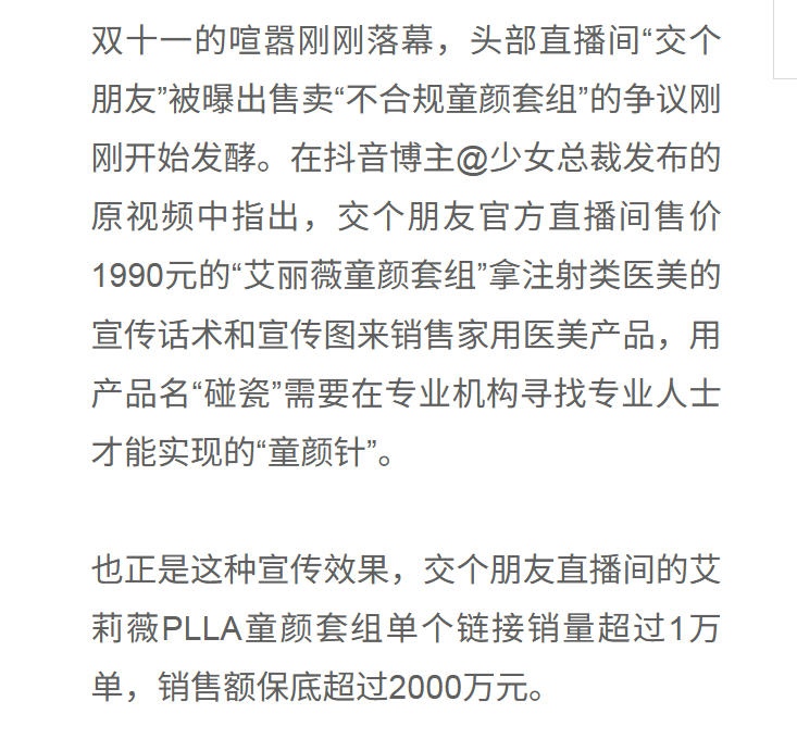 美妆研究所SHOWCASE称,抖音200w+美妆博主@少女总裁指出,交个朋友直播间售价1990元的“艾丽薇童颜套组”涉嫌虚假宣传,产品名称与注射类医美“童颜针”高度相似,宣传话术暗示医疗效果,但实际备案信息缺失且无法在药监局查询。