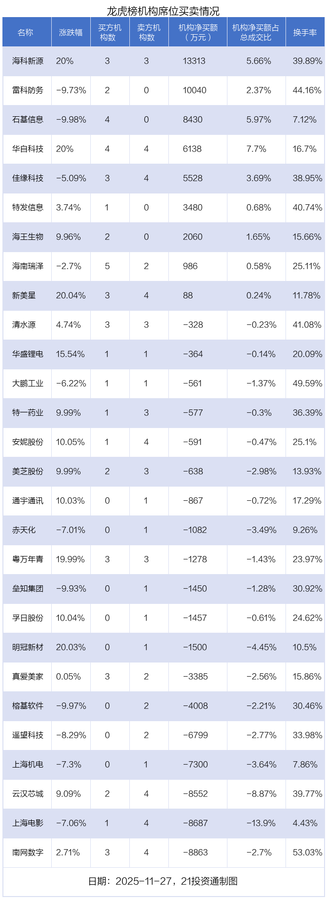 11月27日,28只个股龙虎榜出现了机构的身影,机构合计净卖出8224.31万元。具体来看,机构净买入9股,净卖出19股。