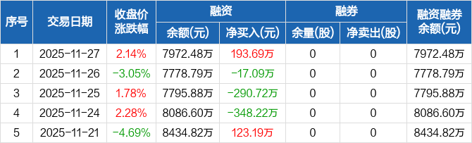 多浦乐:融资净买入193.69万元,融资余额7972.48万元(11-27)