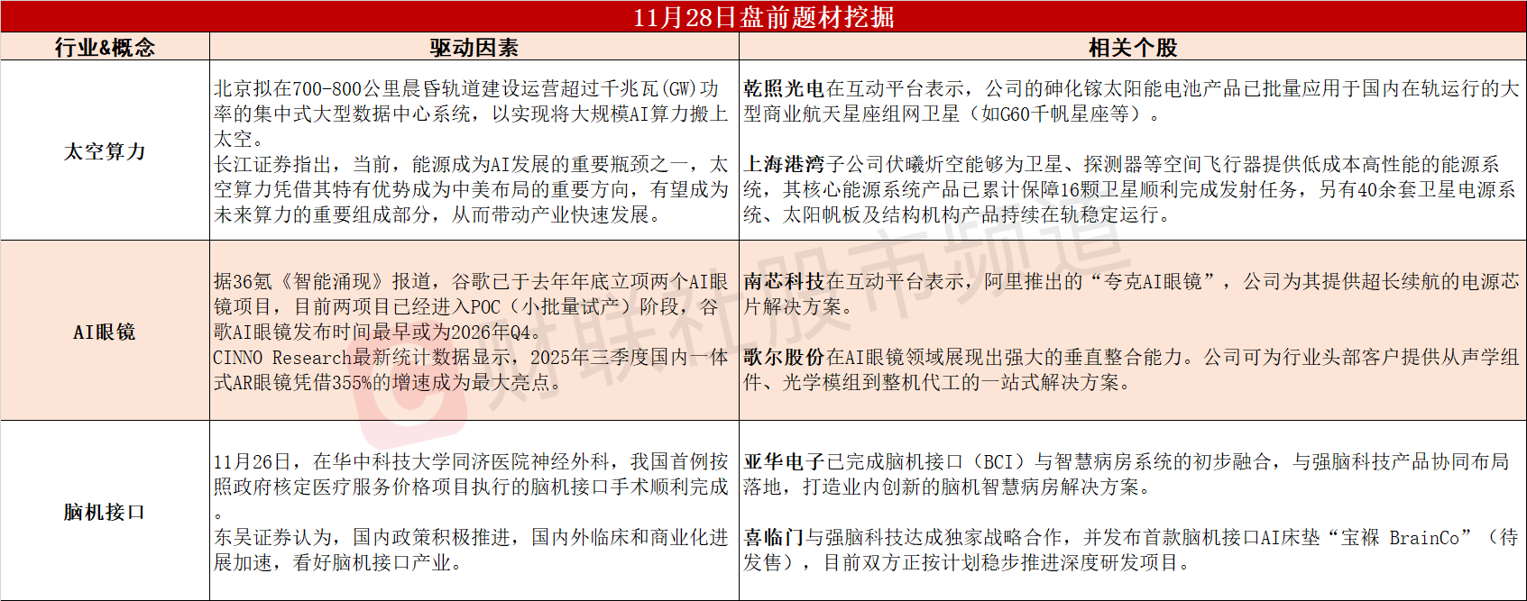 ①北京加速布局太空数据中心,太空算力将成未来算力产业重要方向。②谷歌已重启AI眼镜项目,AI眼镜产业链近期催化密集。③全国首例“医保价”脑机接口手术完成,脑机接口产业加速落地。