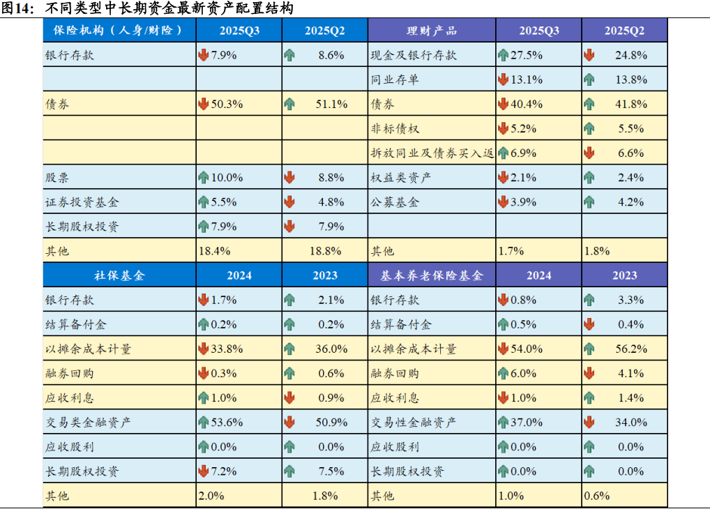 我国险资/理财/养老金规模超70万亿且持续增长,资产配置呈“固收为基、权益渐进”特征。险资/社保重仓A股以金融为核心,同时逐步提升科技等成长领域配置。行业上,险资在非金融板块仍以稳健防御为底色,高股息偏好显著强于社保;社保基金的投资更具逆周期特征,非金融行业轮动更快,重仓股投资分散度明显高于险资,成长与周期属性更为突出。