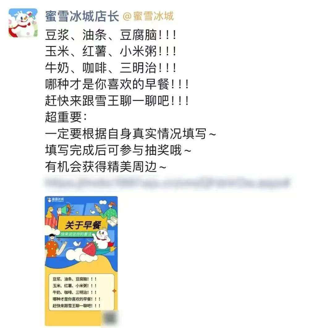 近日,有网友在社交平台上分享蜜雪冰城关于早餐调查的问卷,并发文:蜜雪冰城要开始卖早餐了?还有部分网友晒出了早餐系列的产品截图,售价均为5元。