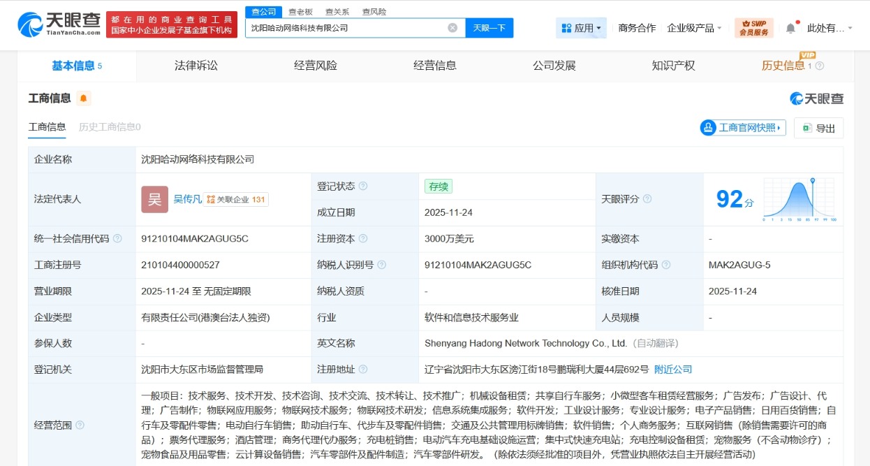 南方财经11月28日电,天眼查App显示,近日,沈阳哈动网络科技有限公司成立,法定代表人为吴传凡,注册资本3000万美元,经营范围含机械设备租赁、共享自行车服务、小微型客车租赁经营服务、物联网应用服务、物联网技术服务、物联网技术研发、信息系统集成服务、工业设计服务、专业设计服务等,由哈啰出行旗下HongKongRideTechLimited全资持股。