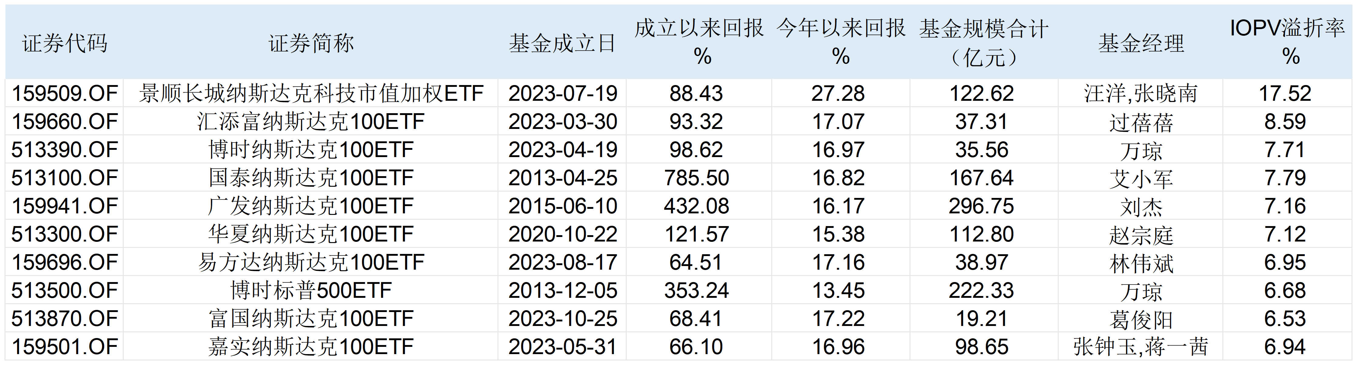 但是频繁的风险提示并没有给QDII投资热潮“降温”。截至11月27日收盘,85只QDII-ETF基金中有50只仍位于溢价状态,其中溢价率最高的是景顺长城纳指科技ETF(159509.SZ),溢价率达到了17.52%。