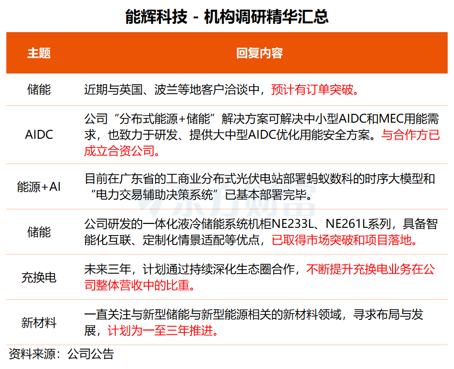 储能业务方面,能辉科技表示,公司研发的一体化液冷储能系统机柜NE233L、NE261L系列,已取得市场突破和项目落地。