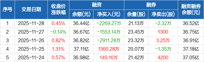 融资方面,当日融资买入9444.02万元,融资偿还1.17亿元,融资净偿还2269.27万元,连续3日净偿还累计6733.68万元。融券方面,融券卖出2300股,融券偿还2.55万股,融券余量21.13万股,融券余额758.78万元。融资融券余额合计36.52亿元。