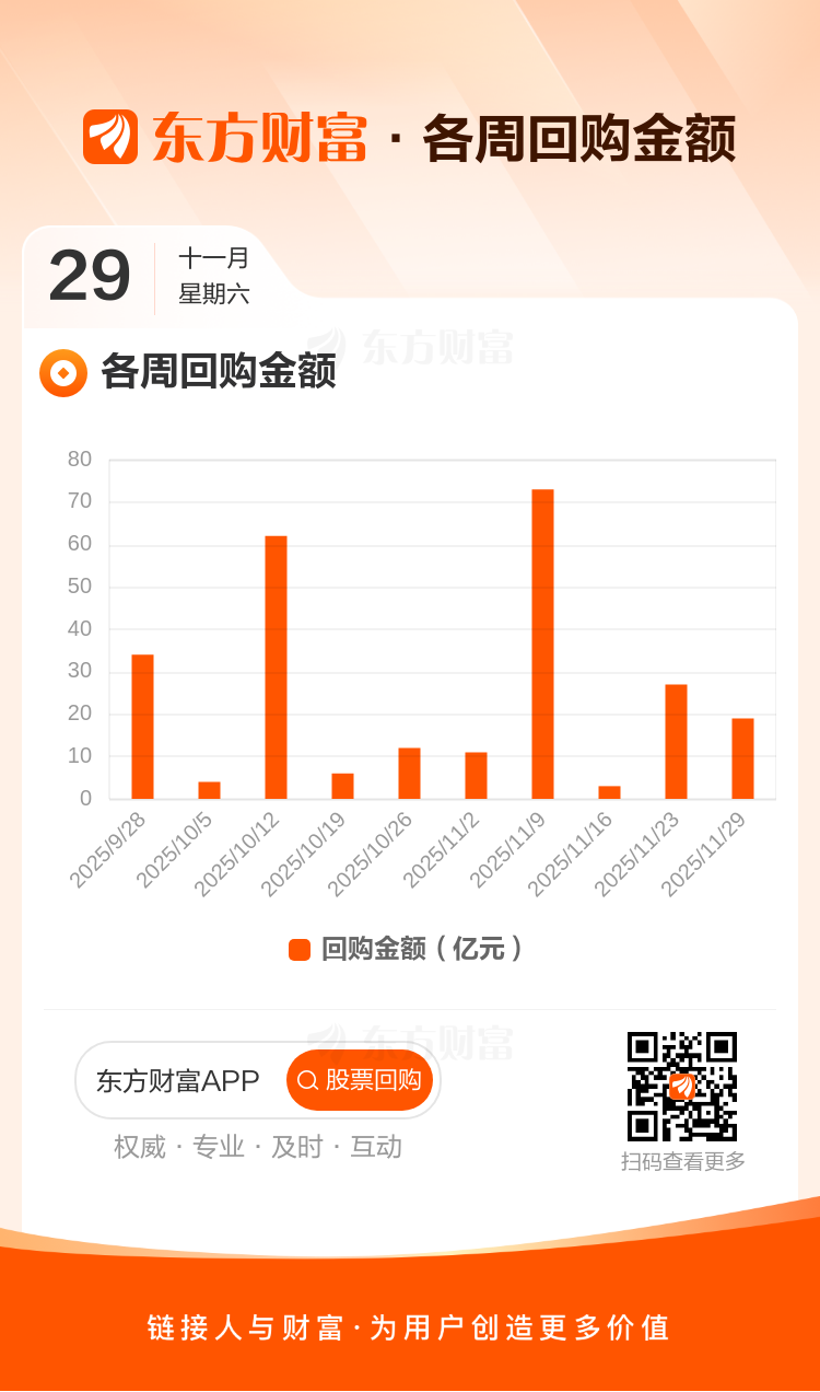 东方财富Choice数据显示,截至11月29日,本周有20家A股公司披露回购实施情况,合计回购金额18.77亿元,低于上周的26.52亿元。