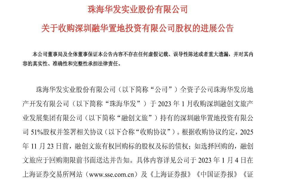 通过此次交易,华发股份全资持有融华置地。当时签署的收购协议中,双方约定融创保留2025年11月23日前的回购权,不过,协议并未明确回购价格的具体机制。这一条款的模糊性,也为今日的变局埋下伏笔。