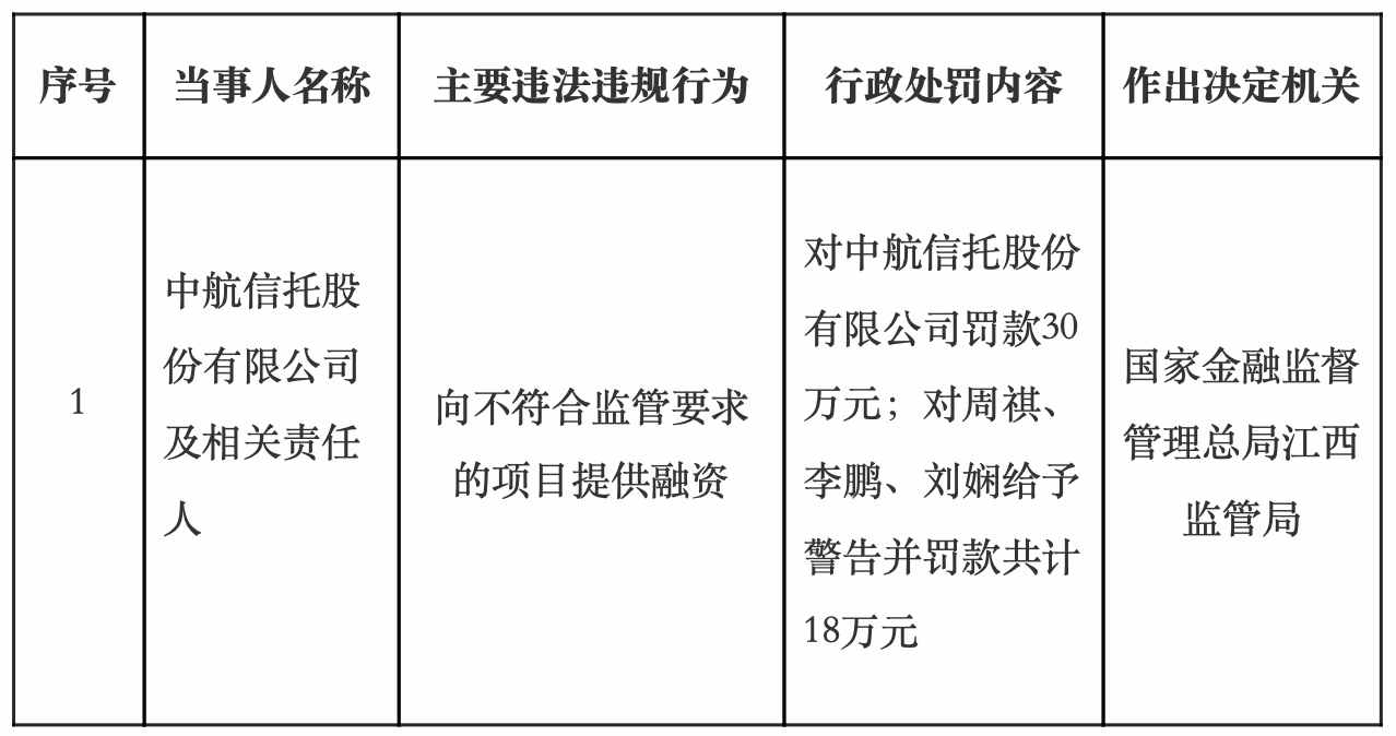 因向不符合监管要求的项目提供融资,对中航信托股份有限公司罚款30万元;对周祺、李鹏、刘娴给予警告并罚款共计18万元。