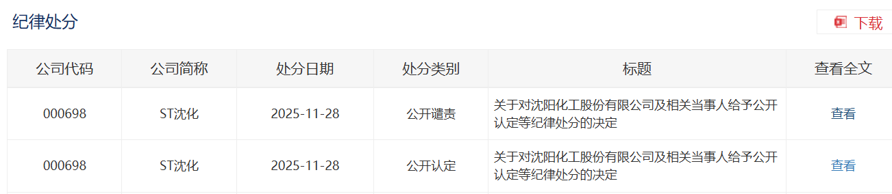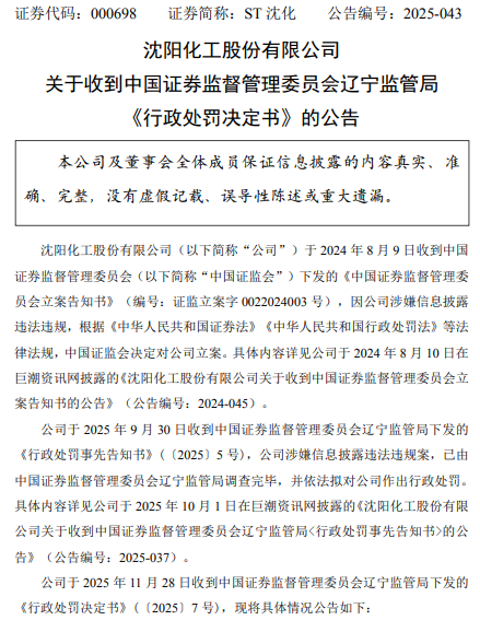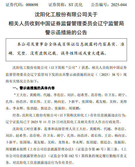警示函显示,经查,沈阳化工存在信息披露违法行为,辽宁证监局已于2025年11月25日对沈阳化工及相关责任人作出行政处罚。