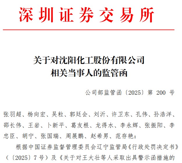 11月28日,深交所还发布《关于对沈阳化工股份有限公司相关当事人的监管函》指出,沈阳化工董事会秘书张羽超、独立董事杨向宏、独立董事吴粒、副总经理郭廷会、时任董事刘沂、时任监事许卫东、时任监事孔伟、时任监事孙浩洋、时任副总经理邵长伟、时任董事王岩、时任独立董事卜新平、时任董事葛友根、时任监事龙得水、时任监事李永辉、时任副总经理张振阳,未能恪尽职守、履行忠实勤勉义务,违反了深交所有关规定,对公司上述违规行为在职责范围内负有责任。