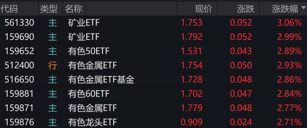 有色金属概念股走强,矿业、有色相关ETF涨约3%
