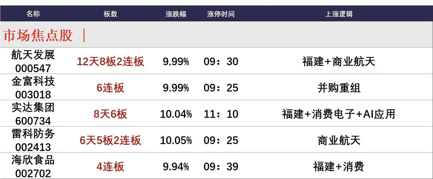 今日午盘全市场共55股涨停,连板股总数14只,22股封板未遂,封板率为71%(不含ST股、退市股)。焦点股方面,商业航天概念股航天发展12天8板、雷科防务6天5板,福建本地股实达集团8天6板、海欣食品4连板,并购重组的金富科技6连板。