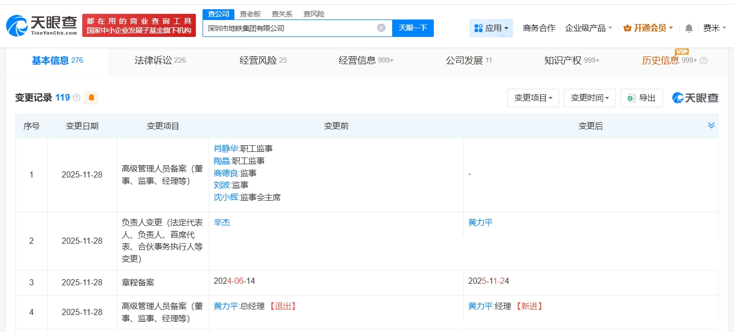 南方财经12月1日电,天眼查工商信息显示,近日,深圳市地铁集团有限公司发生工商变更,辛杰卸任法定代表人,由黄力平接任,同时,黄力平由总经理改任经理。该公司成立于1998年7月,注册资本约466.8亿人民币,经营范围包括地铁、轻轨交通项目的建设经营、开发和综合利用等,由深圳市人民政府国有资产监督管理委员会全资持股。