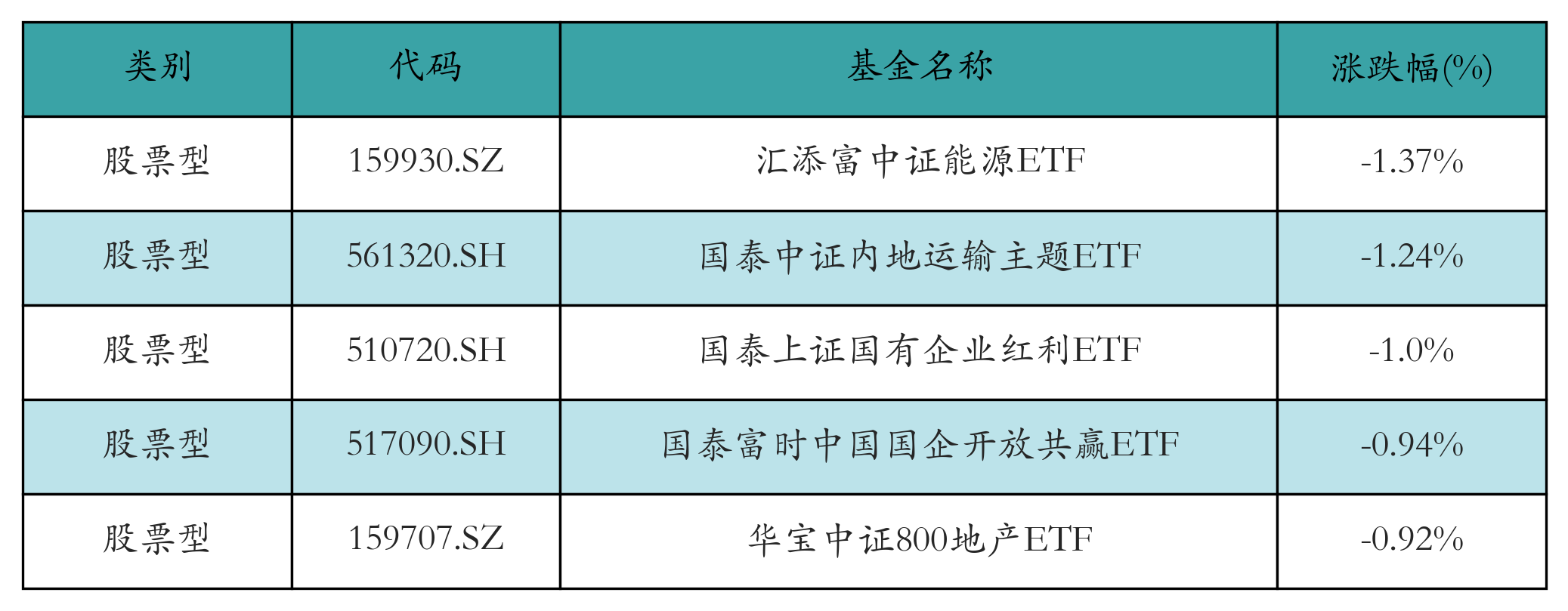 上周股票型ETF跌幅最大的5只ETF及其收益率分别为:汇添富中证能源ETF(-1.37%)、国泰中证内地运输主题ETF(-1.24%)、国泰上证国有企业红利ETF(-1.0%)、国泰富时中国国企开放共赢ETF(-0.94%)、华宝中证800地产ETF(-0.92%)。详情见下表: